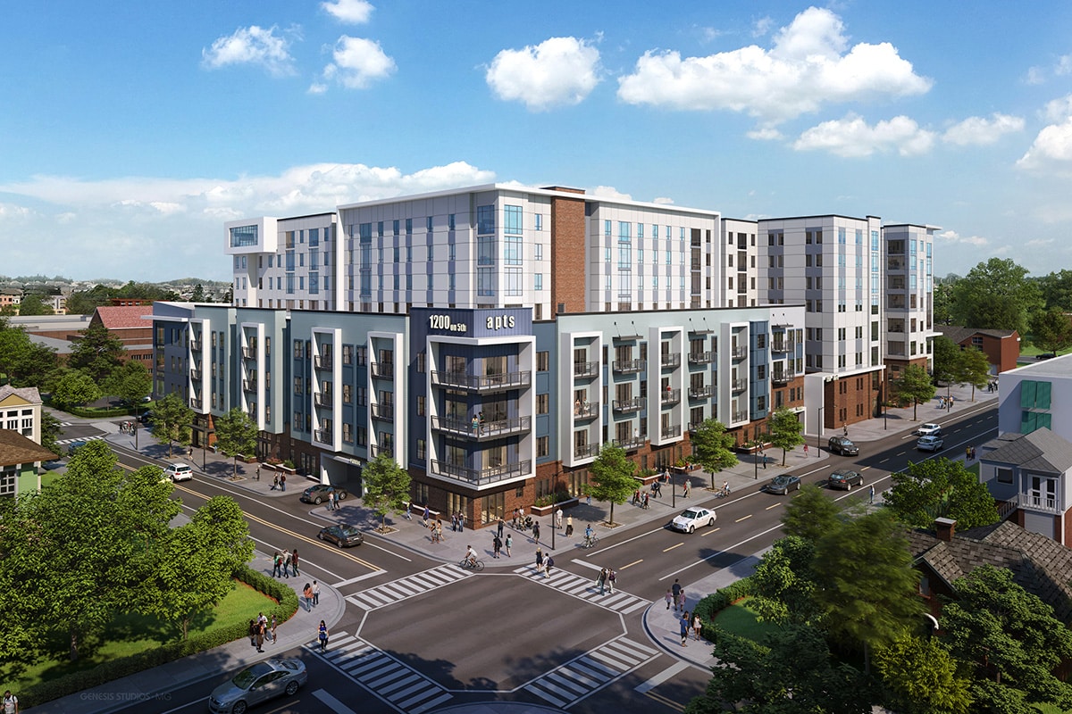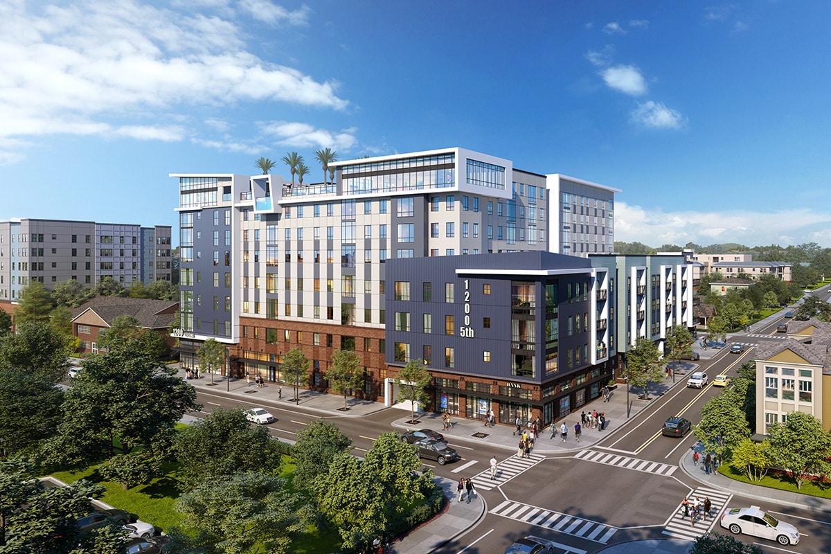 Our design team, consultants, and Client worked closely together to make UFORA a community with transformational impact. Its 232 units (663 bedrooms) are supported with five levels of parking in a centralized structure, an expansive ground floor leasing center, and a luxuriously amenitized 8th floor that houses the pool deck, fitness center with sauna, yoga room, and an outdoor patio. A second interior courtyard on the ground level provides residents with additional shared outdoor space.